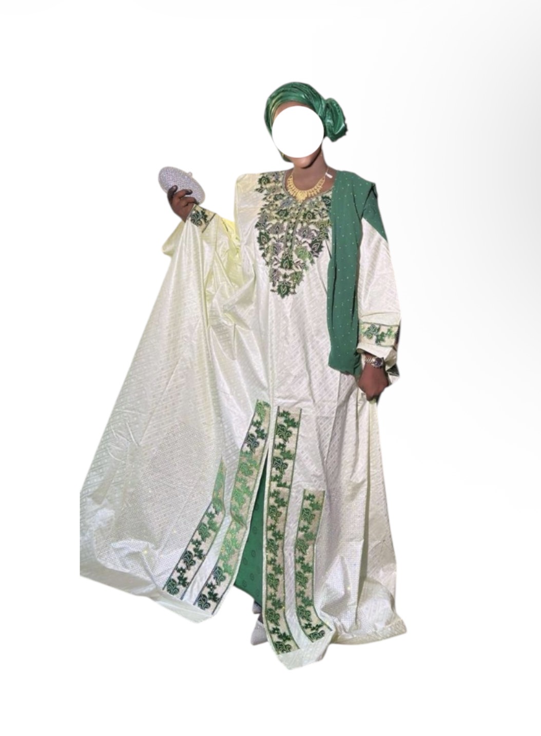 Bazin de 5 mètre vendu avec son pagne et son foulard, porte une seule fois. Acheter à 150.000 chez Amina Fashion