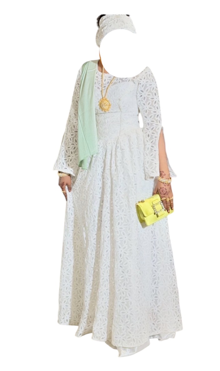 Brodé acheté 50.000 et cousu à 10.000, porté une fois, avec foulard