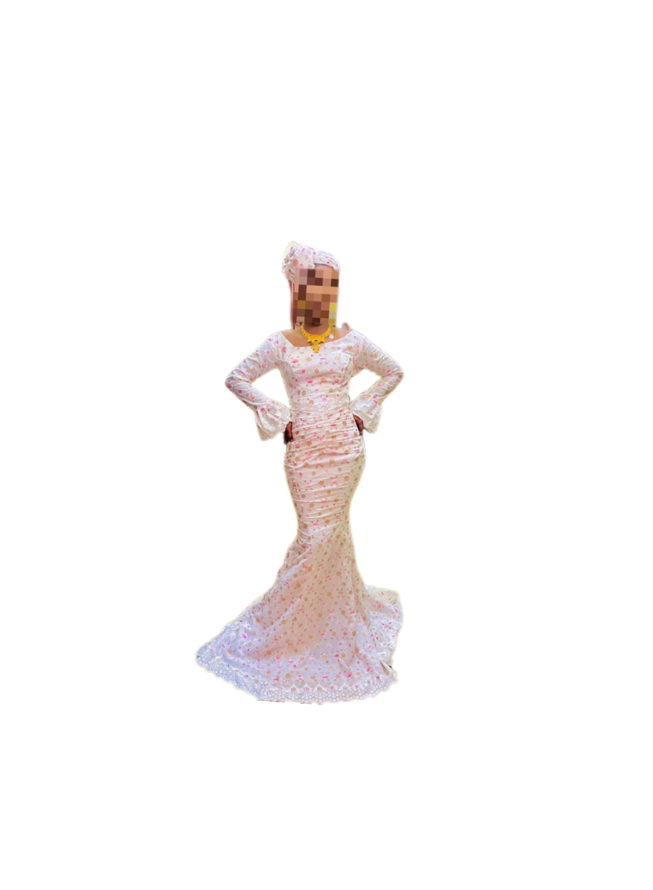Brodé acheté à 100 000 et cousu à 60 000, porté une fois, vendu avec foulard, réserves disponibles