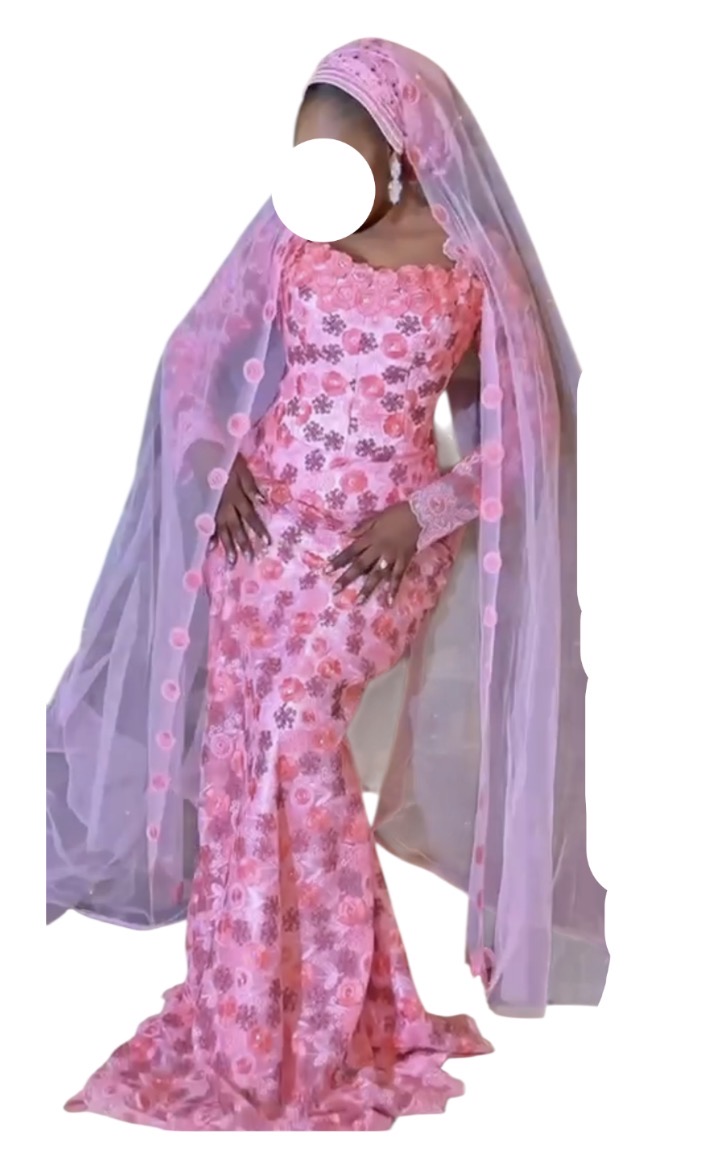 Acheter à 60.000 et cousu à 50.000 FCFA chez Diallo couture, avec des réserves, porté une fois, avec un turban et un grand voile