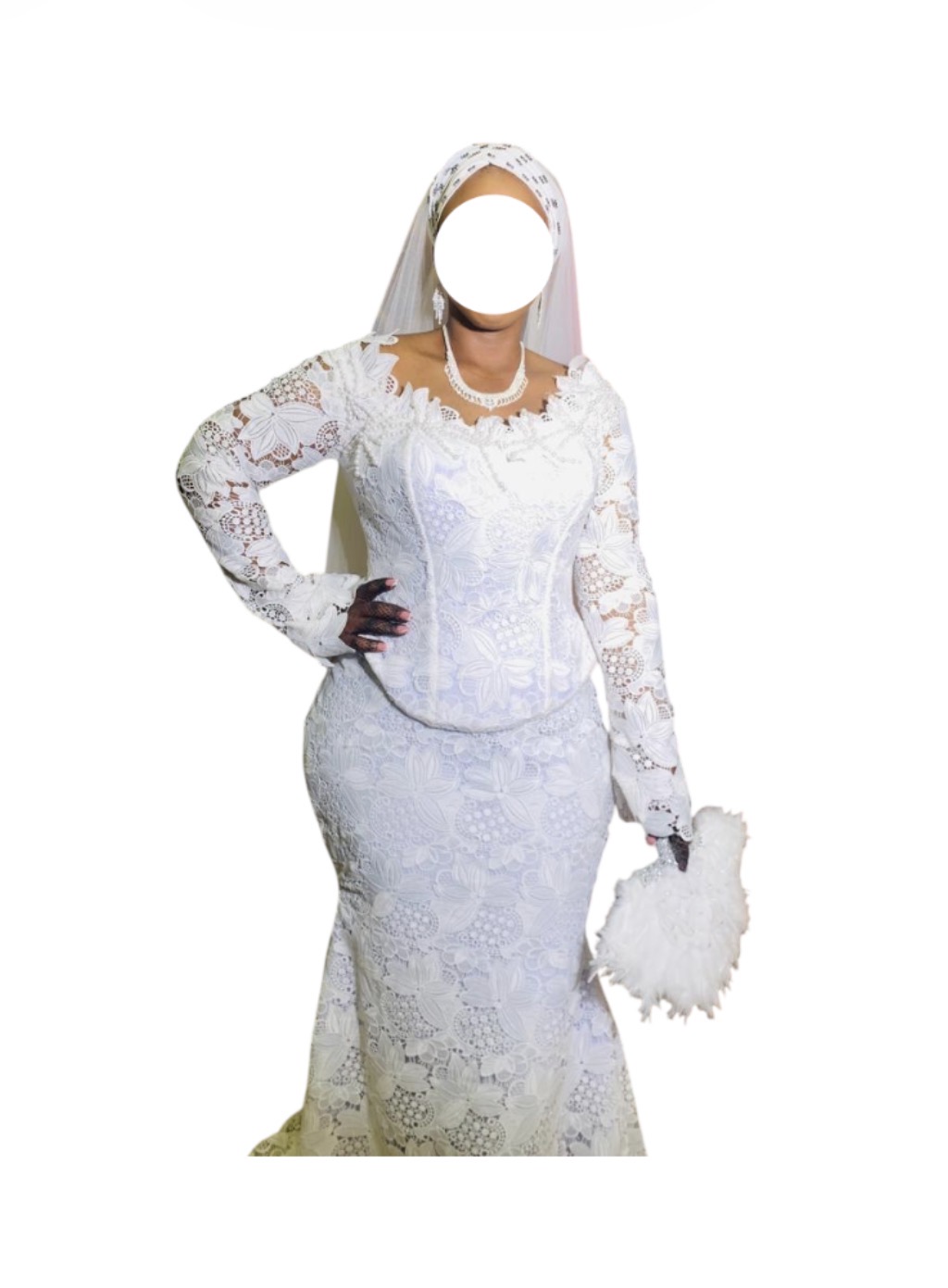 Confectionner à 150.000, porté une fois, avec foulard et voile, et avec éventail